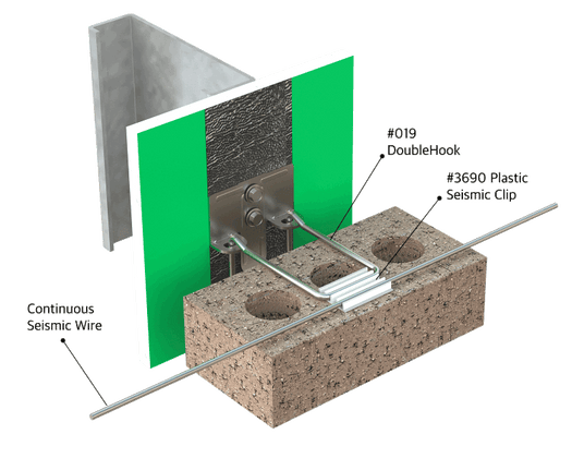 Plastic Seismic Clamp accepts 9 gauge, 3/16" diameter continuous seismic wire. Can be used in any adjustable system consisting of a pivot or triangle and rebar wire for horizontal seal.